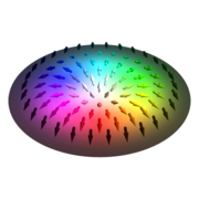 A magnetic skyrmion consists of non-collinear magnetic moments: the colored arrows in the figure above. It is topologically non-trivial,